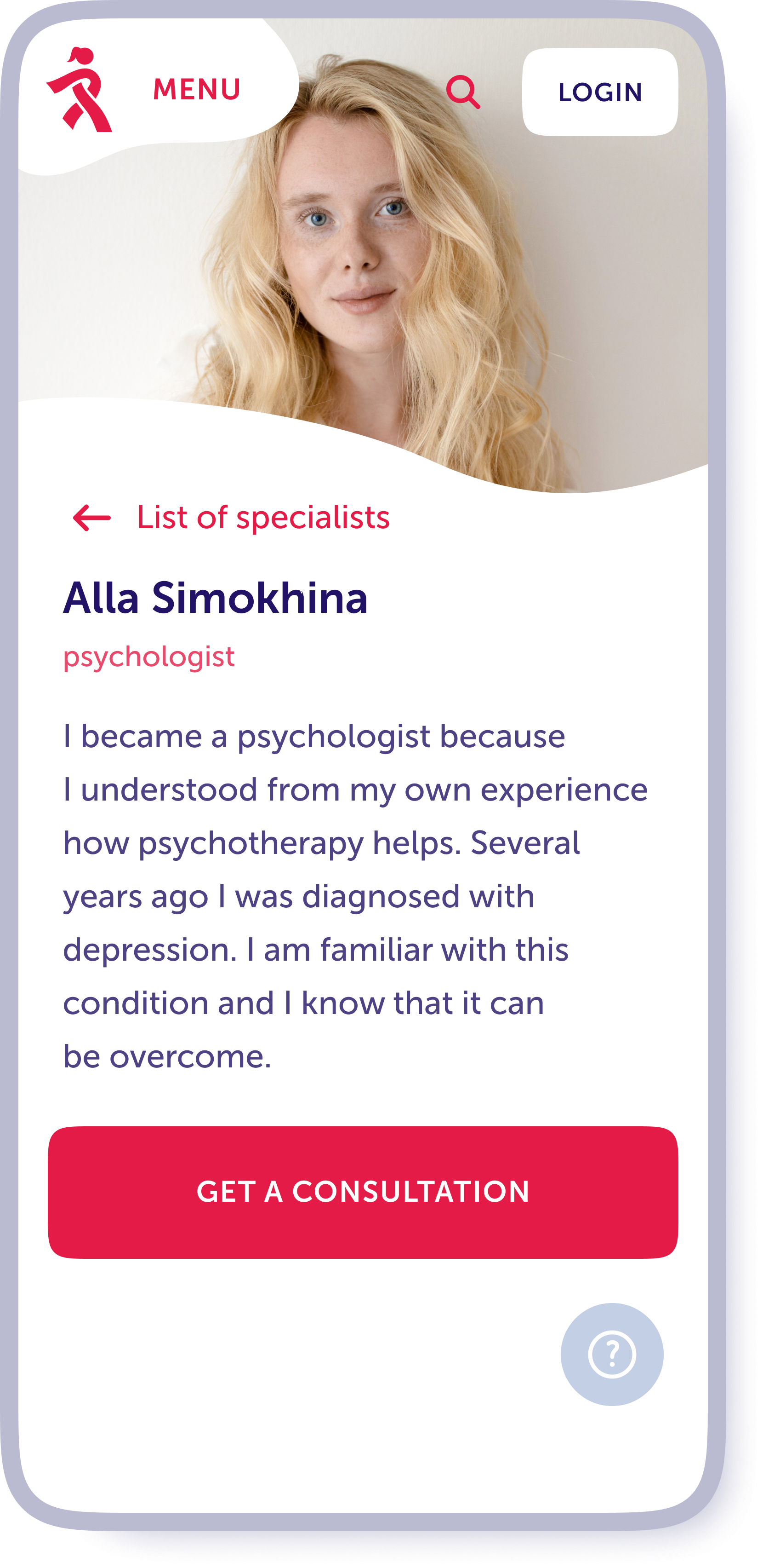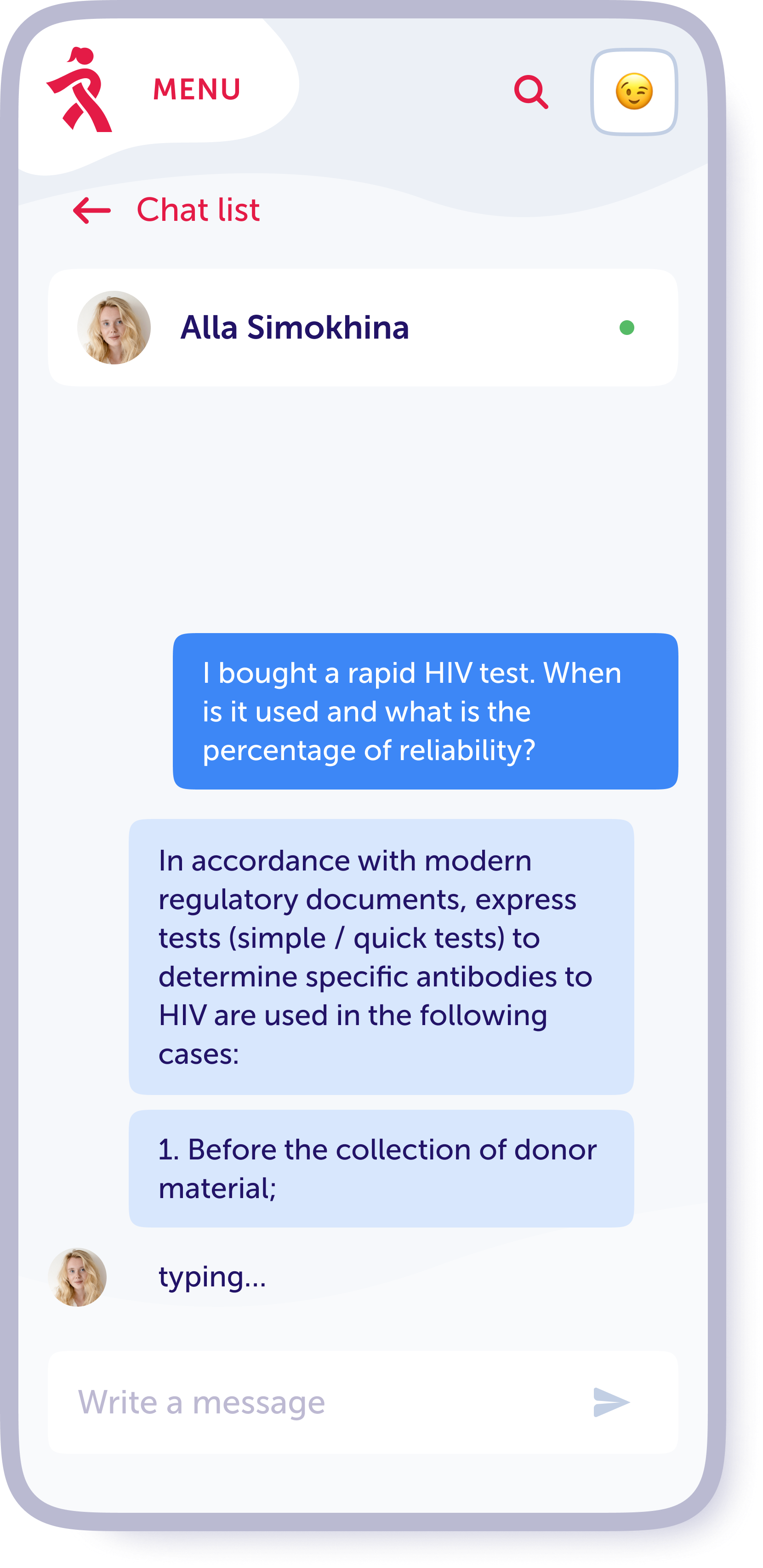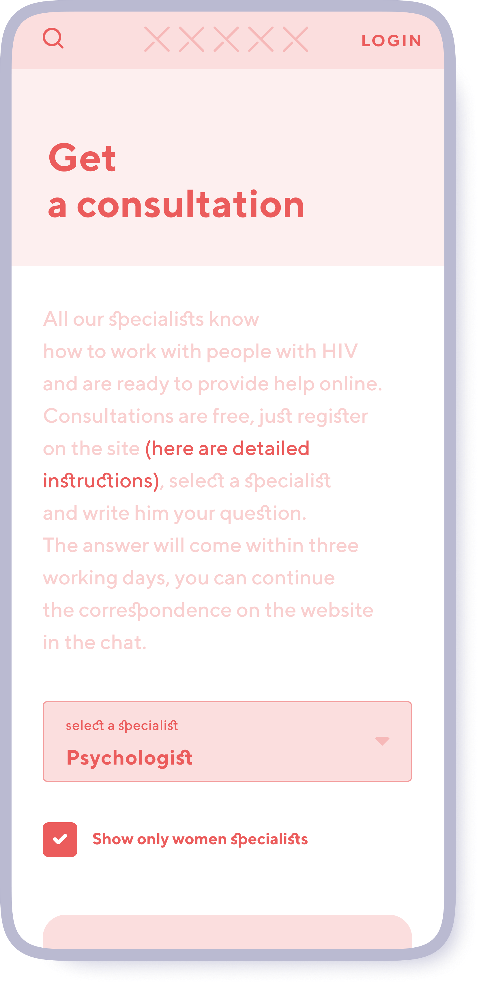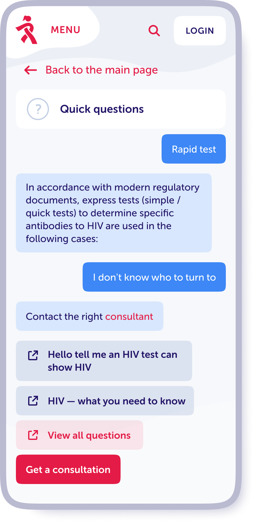 To get a consultation, the user goes through a quick registration by phone number. But even without registration, women can get answers to frequently asked questions.