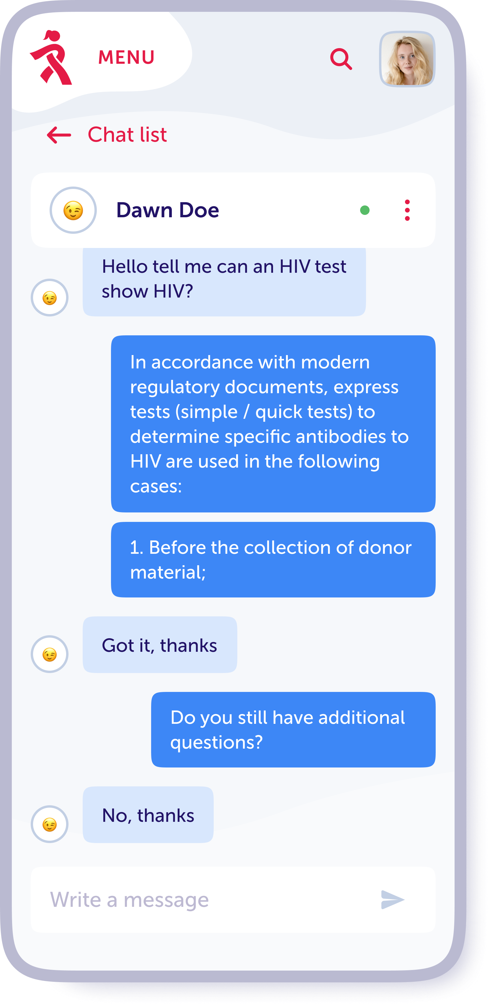 To get an answer to the question is essential when asking a doctor. The site does not show either the doctor’s name or her discipline in the chat list. Instead, the question is always the focus.